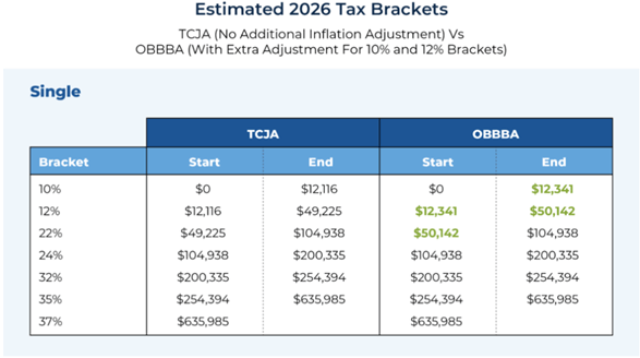 Key Takeaway: The bracket thresholds have also been adjusted upward for inflation, which may help reduce your tax liability if your earnings have remained steady. Essentially maintaining the lower tax rates and size of the brackets provides some of the biggest potential tax savings in the bill and presents the opportunity to do or make larger Roth IRA conversions.
