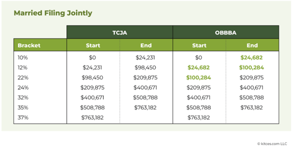 The individual income tax brackets introduced by the TCJA have now been made permanent. That includes the 37% top marginal rate (instead of returning to 39.6%) and lower rates across most tax brackets.