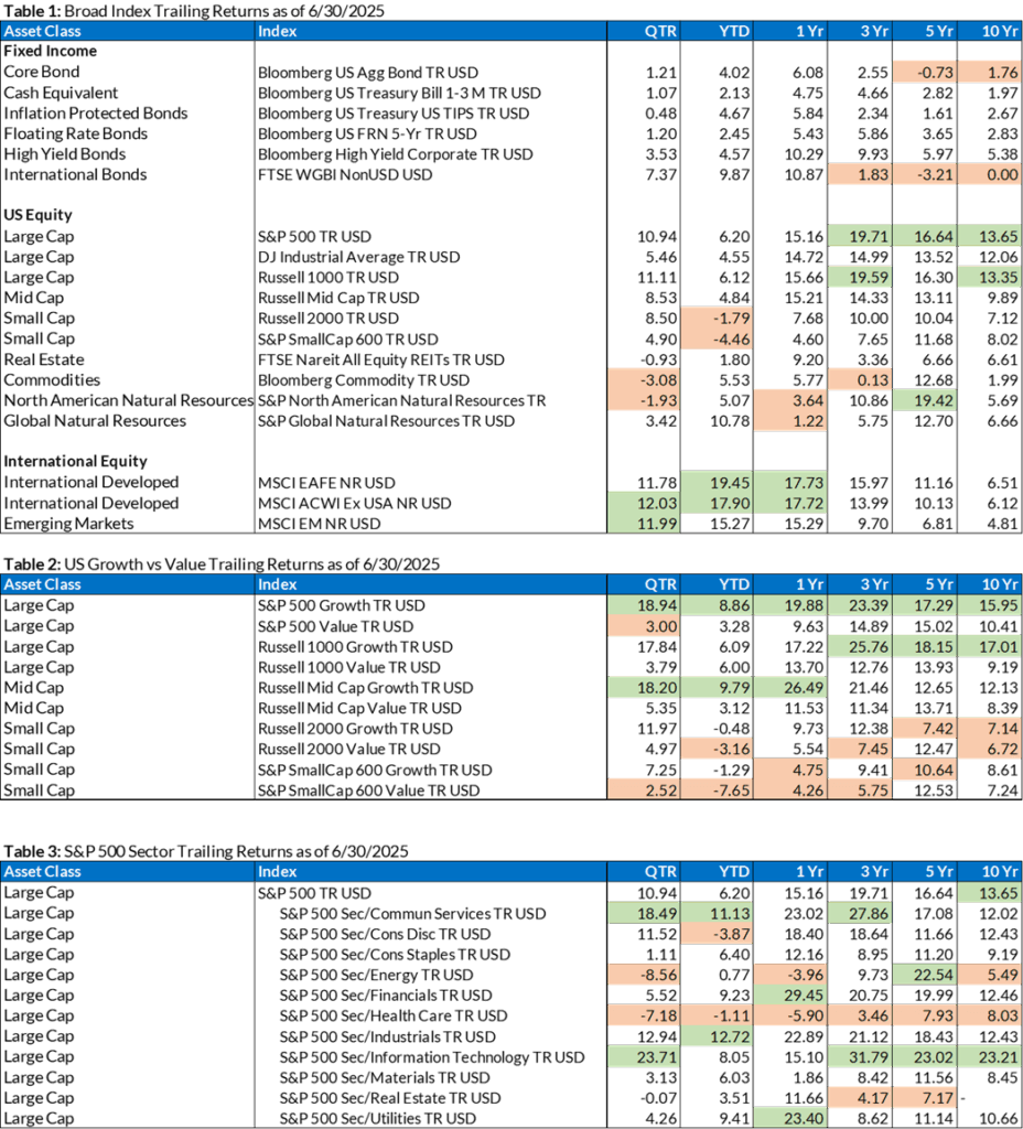 Following the sharp volatility in April, driven by tariff announcements, markets have rebounded impressively. Fueled by tech outperformance, the S&P 500 index rallied more than 24% from its April 8th bottom, finishing the first half of the year at an all-time high. The Index Trailing Returns tables at the end of this newsletter show how returns were distributed across asset classes and industries, including international stocks outperforming the US stock asset classes, highlighting why we believe it is important to hold a diversified portfolio.
